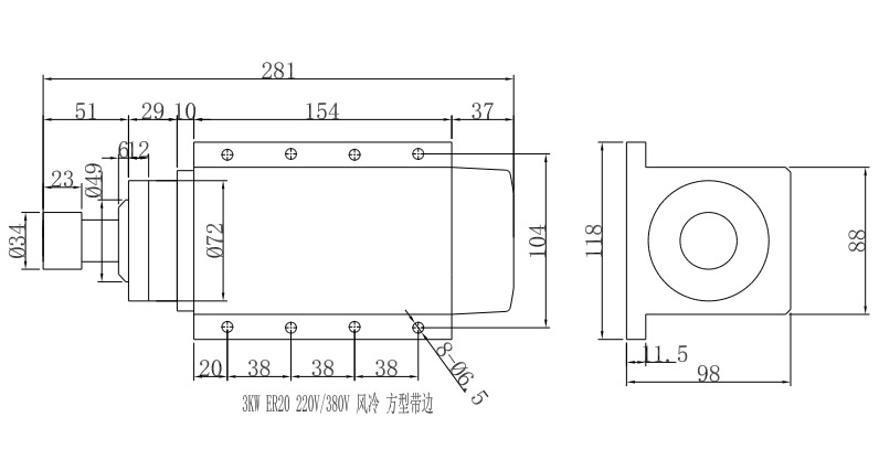 3KW/ ER20/220V-380V 方型带边风冷电机